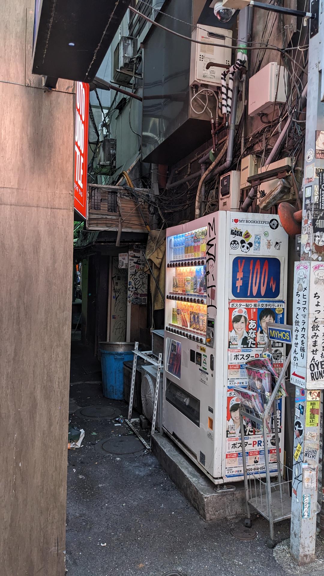 前の汚い自販機を探す挑戦は新宿やゴールデン街でちょっと簡単でつまらなくなる。でも、この自販機は落書きやステッカーだけじゃなくて、背景で狭い路地で電線や室外機や管があって、とても気に入った。自販機の横にMYHOSという無料な雑誌があった。MYHOSは歌舞伎町のホスト雑誌だけど、ホスト向きかホストクラブの客向きかよく分からない。MYHOSのウェブサイトによると2024年7月からネットに載られることになったから、これは古い刊かもしれない(それとも私は誤訳しちゃったかもしれない)。