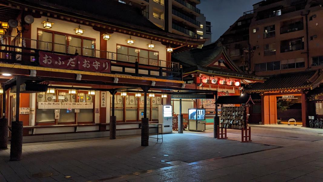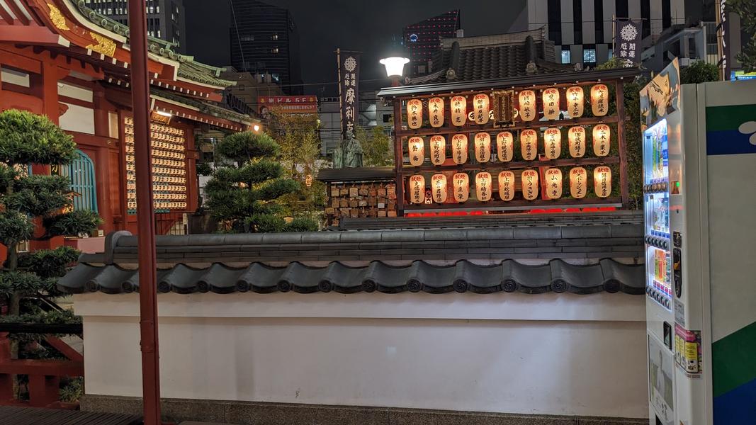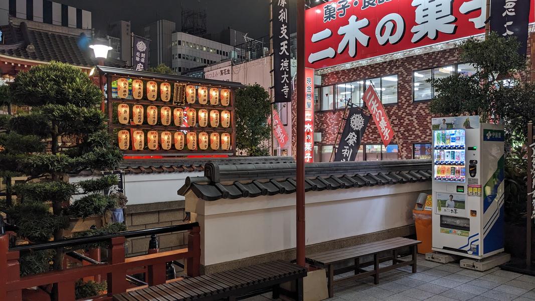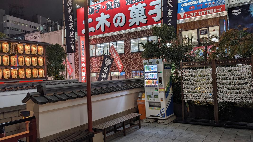 この自販機は摩利支天徳大寺の前にあって、寺そのものはアメ横にある階段の上にあった。夜の美しい光、賑やかな商店街とほとんど人がいなくて静かな寺のコントラスト、上から商店街の景色が好きだった。